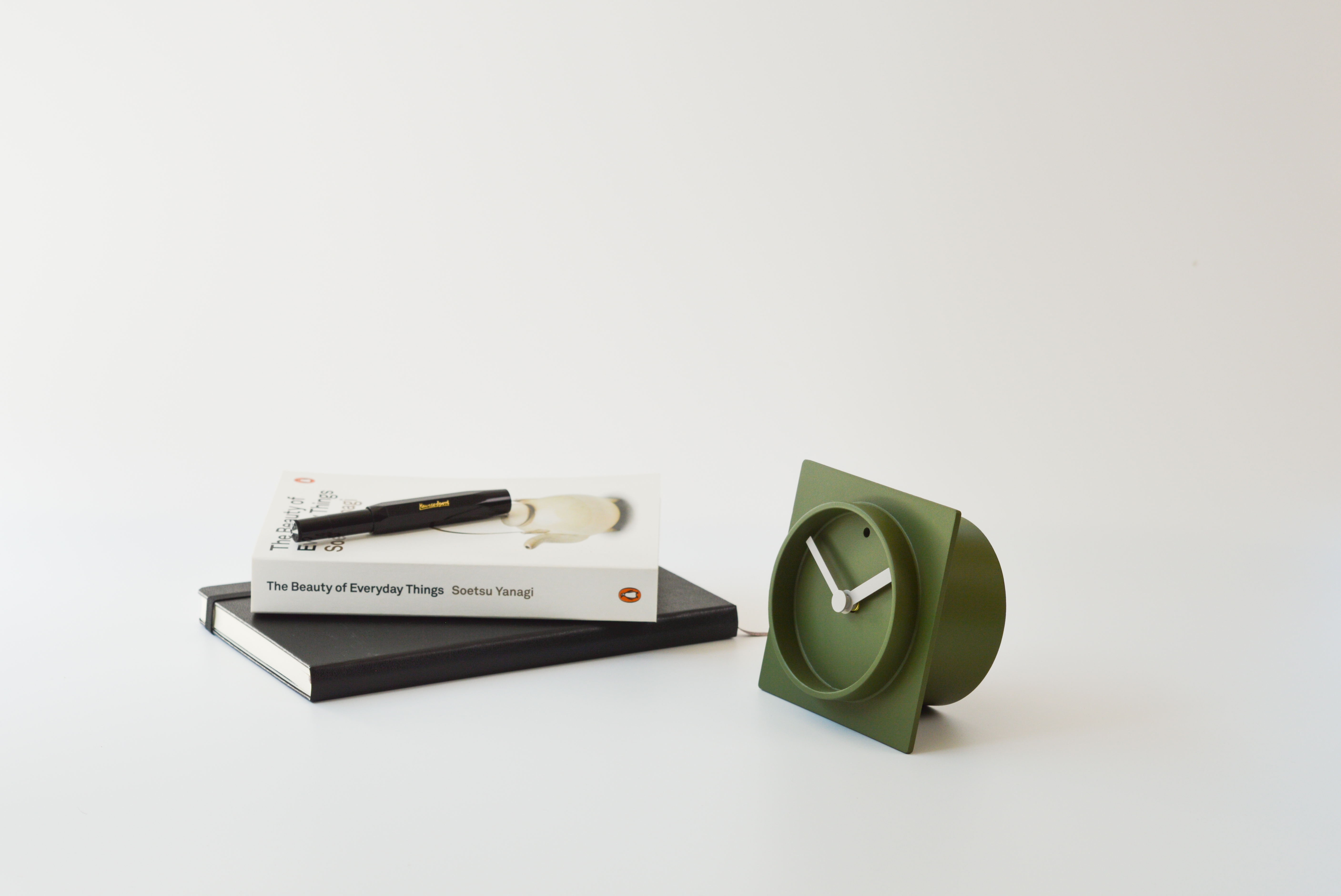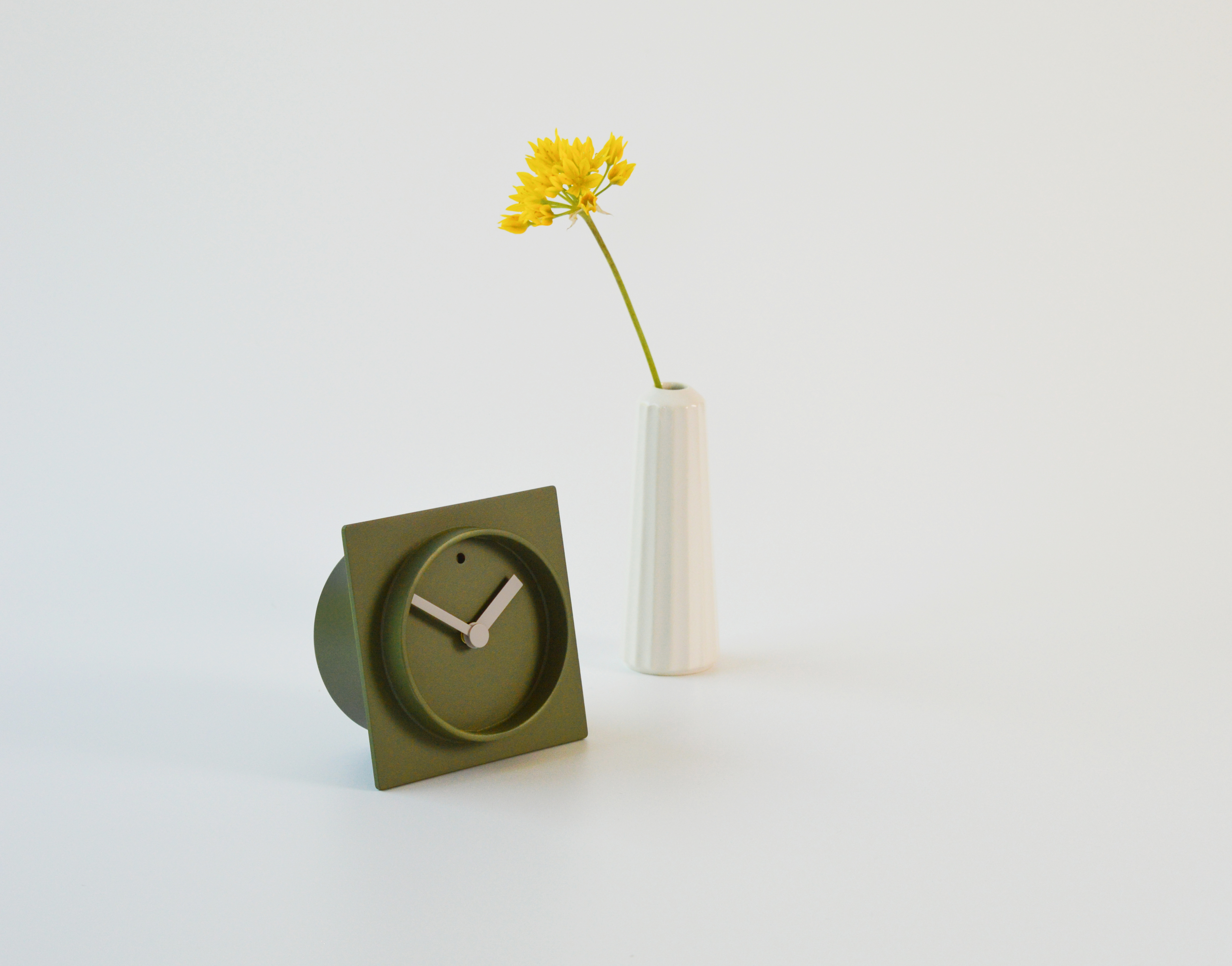 Desk clock in powder coated aluminium. The plane of the face intersects the body to tilt the clock toward the viewer.